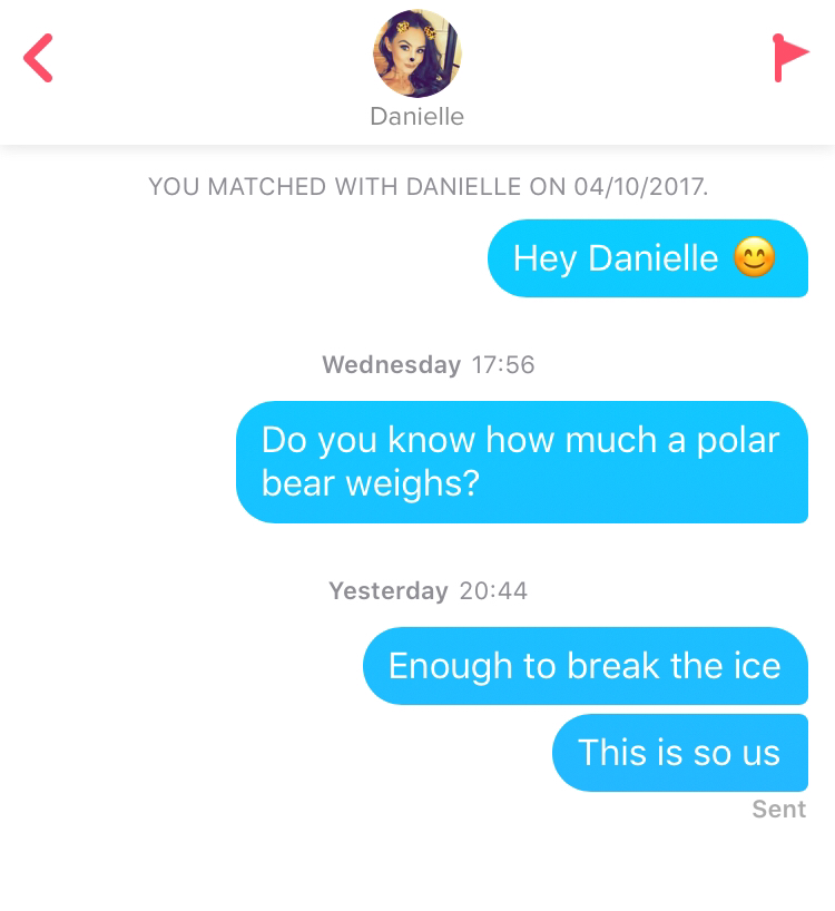 Danielle had either deleted Tinder or wasn’t impressed by my chat. Why didn’t she unmatch me? My problem is I need closure, I would much prefer someone to say Yes or No than to ghost me. Like come on, have some respect. I mean my polar bear ice breaker should of been enough!