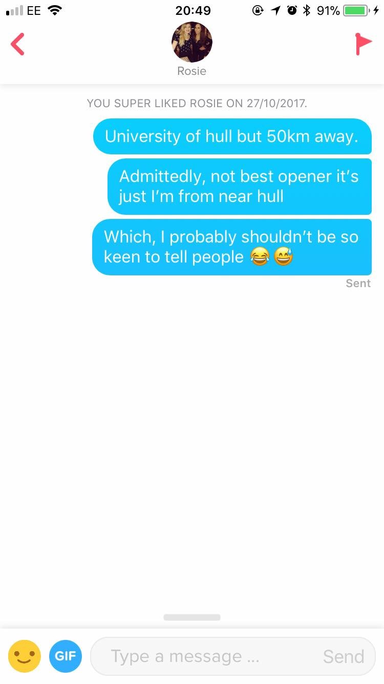 Another thing to note, is that “super liking” is apparently a big No No, although Rosie above seemed to be okay with it, well until I spoke. Maybe just not okay with my weird opener with absolutely nothing to offer her in it. It wasn’t long before I was unmatched ! haha.
